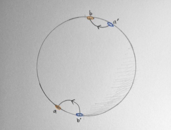 To do so, we do the following trick: We rotate one pair of portals continuously around the sphere, until they match up with the other pair. Then the loop disappears to a point!
